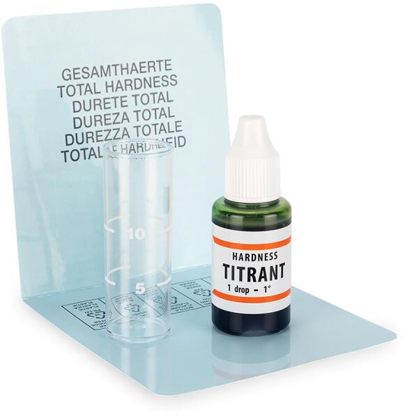 1. A mellékelt tégelyt töltse fel az első jelzésig (5 ml) a merendő vízzel. Ha a második jelzésig (10 ml) tölti, akkor 1 csepp a titráló folyadékból 0,5 nk° keménységi foknak fog megfelelni.